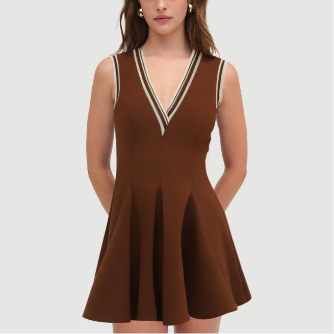 This summer mini dress features a classic V-neck design and sleeveless silhouette, showcasing the elegant lines of a woman’s neck and slender arms for a refreshing and effortless summer look. The delicate pleating of the skirt adds layering and visual interest, adding a touch of movement and style. The loose, comfortable silhouette is perfect for casual everyday wear, creating a relaxed yet sophisticated look.The fabric is made of 100% polyester and woven with a fine, durable texture, offering excellent breathability and abrasion resistance, ensuring long-lasting comfort and durability. The warm, natural brown hue complements many skin tones and easily coordinates with a variety of shoes and accessories, creating a simple and stylish summer casual look.This dress not only focuses on appearance but also on comfort and practicality, making it an ideal summer wardrobe piece for shopping, dating, or everyday gatherings.Care Instructions:Hand wash in cold water with a mild neutral detergent and avoid bleach. When machine washing, turn the garment inside out, place in a laundry bag, and select the gentle cycle. Keep the water temperature below 30°C to prevent shrinkage and fabric damage. Gently squeeze out excess water after washing, avoiding wringing to maintain the pleat structure. Hang to dry in a cool, well-ventilated area, away from direct sunlight, which can cause fading. Use a low heat setting when ironing to avoid damaging the fabric fibers. Wash separately from similarly colored items to prevent staining and contamination.