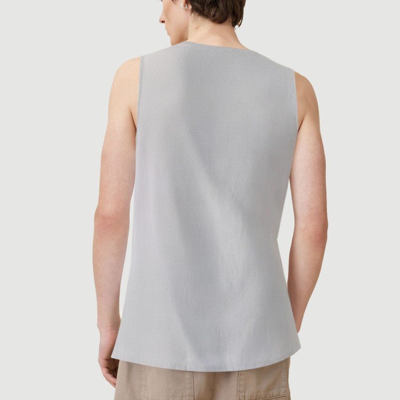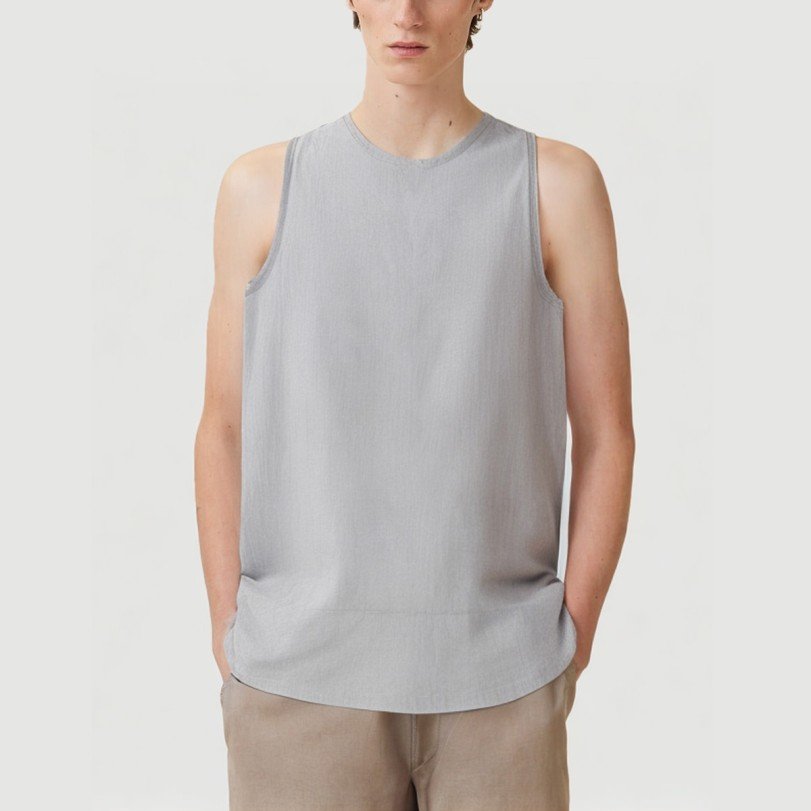 This men’s vest is crafted from a cotton and bamboo blend, combining the soft, skin-friendly feel of natural cotton with the breathable, moisture-wicking properties of bamboo, ensuring freshness and comfort in summer. The high collar provides light coverage around the neck and adds dimension, while the sleeveless silhouette frees up shoulder and arm room, making it suitable for both casual and everyday wear. The high-low hem design, with its shorter front and longer back drop, enhances the look while effectively concealing the waist and creating a flattering silhouette. The simple, solid color scheme is easy to style, easily complementing shorts, casual pants, or jeans, making it a versatile summer wardrobe staple.Care Instructions:Hand wash or machine wash on the gentle cycle, no higher than 30°C, to preserve the softness and elasticity of the cotton and bamboo blend.Use a neutral detergent and avoid chlorine bleach and fabric softeners, which can damage the fibers and their functionality.Turn the vest inside out before washing to reduce friction with the outer layer and protect the high-low hem and seam details.After washing, gently squeeze out the moisture. Do not wring or rub vigorously to prevent the fabric from deforming.Hang in a cool, well-ventilated place to air dry. Avoid direct sunlight, which can cause fading and fiber stiffening.If ironing is necessary, use a low setting and apply gentle pressure inside the garment, avoiding high collars and edges.Wash separately from similar or lighter-colored items to prevent staining and color transfer.