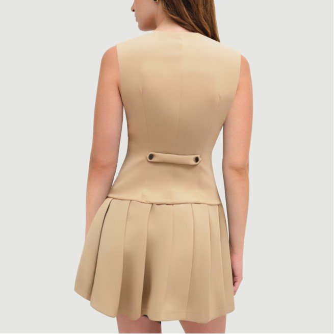 This dress features a simple, elegant V-neck design and a sleeveless silhouette, showcasing the graceful curves of the neck and arms for a refreshing and comfortable summer look. The delicate button embellishment on the front not only enhances the overall design but also adds practicality, making it easy to put on and take off. The slim-fitting silhouette and mini-length skirt length accentuate the legs, creating a stylish yet casual look.The fabric is made of 100% polyester and woven with a fine, durable texture. It also offers excellent breathability and a lightweight feel, ensuring comfortable, breathable wear for extended periods. The natural, warm khaki hue is versatile, perfect for everyday outings, casual gatherings, or casual dates.The overall design combines practicality with aesthetics, making it a versatile addition to the modern woman’s summer wardrobe, ideal for both style and comfort.Care Instructions:Hand wash in cold water with a mild neutral detergent and avoid bleach. When machine washing, turn the garment inside out, place in a laundry bag, and select the gentle cycle. Keep the water temperature below 30°C to prevent shrinkage and fabric damage. Gently squeeze out excess water and avoid wringing to preserve the fabric’s elasticity. Hang to dry in a cool, well-ventilated area, away from direct sunlight, which can cause fading. Use a low heat setting when ironing to avoid damaging the fabric and buttons. Wash separately from similarly colored items to prevent staining and contamination.
