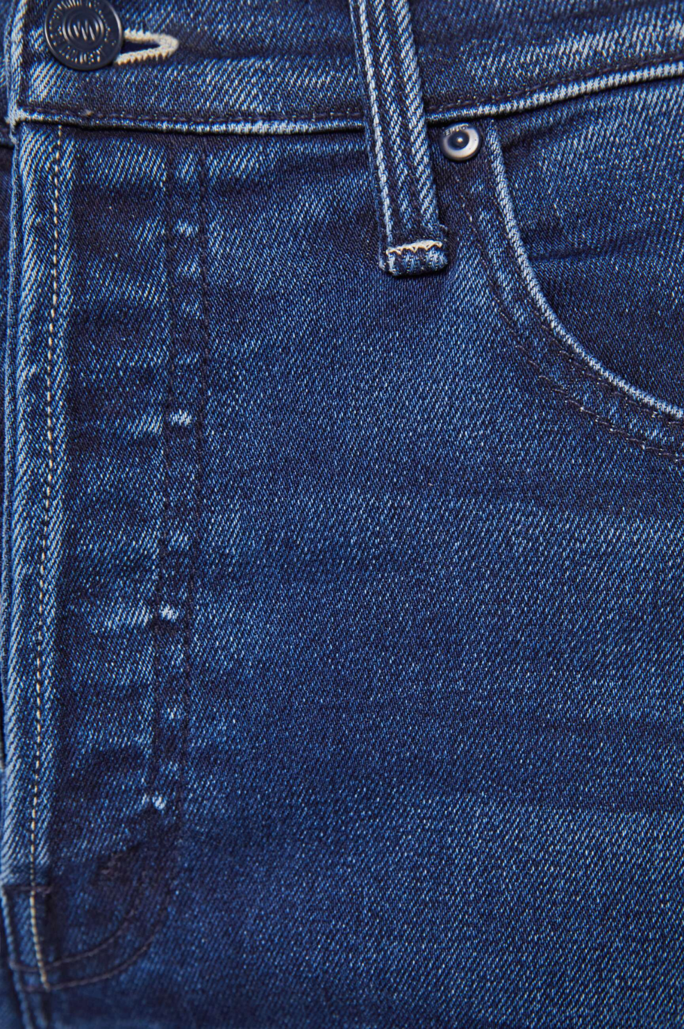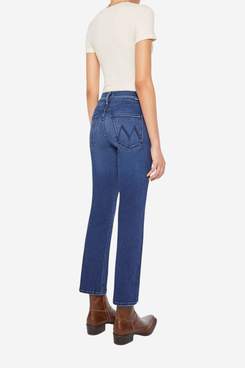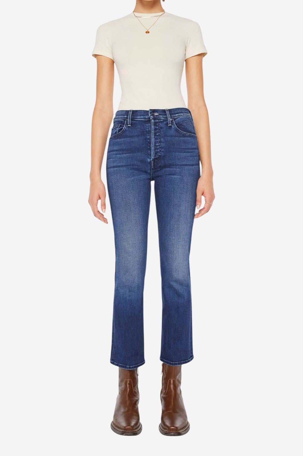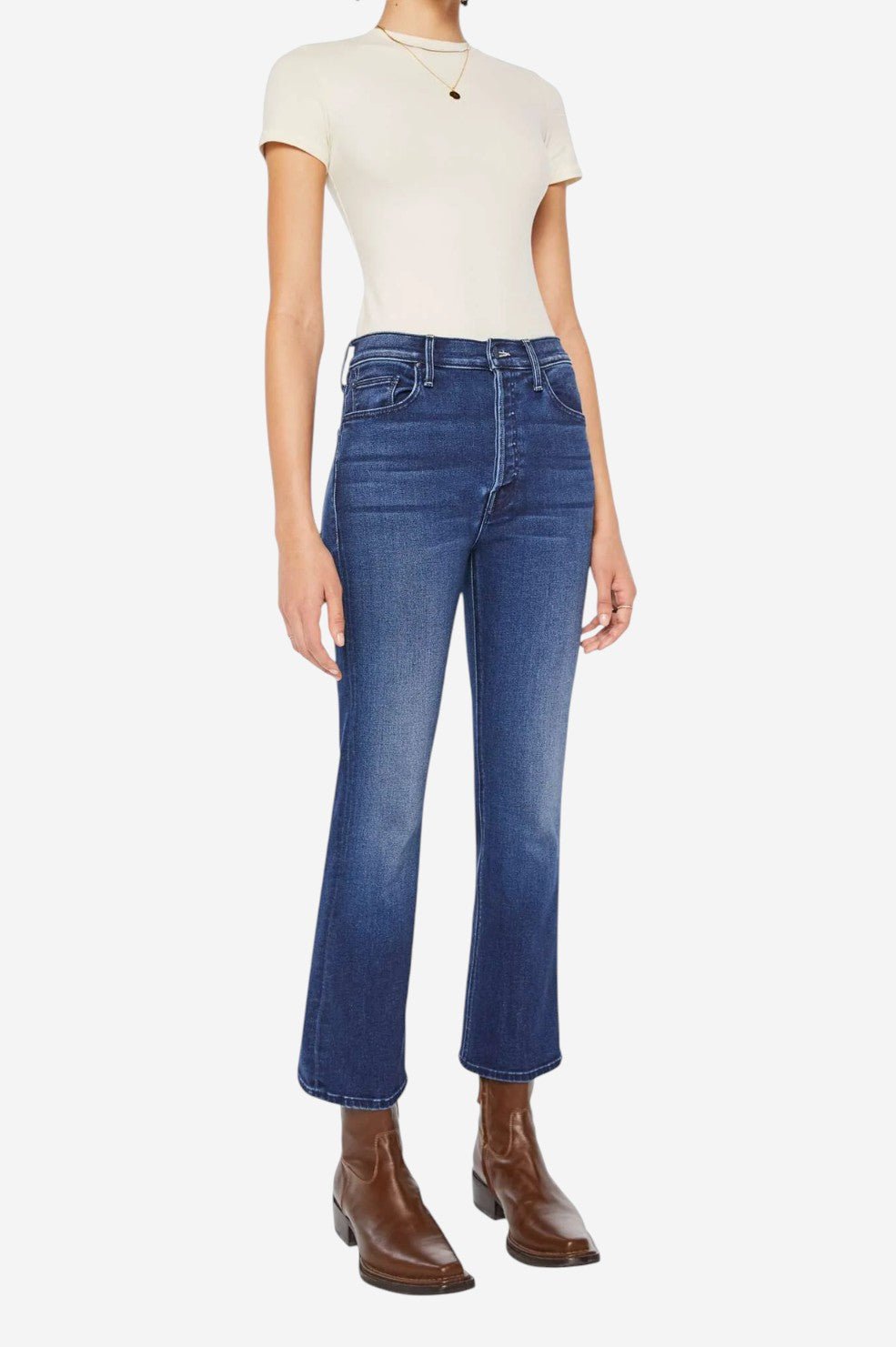 The “Tripper Ankle” from MOTHER is a high-rise flare with a button fly and a clean, ankle-grazing hem. Cut in a deep blue wash with subtle whiskering and fading at the knees, this jean channels a polished yet easygoing mood. The slight stretch in the denim ensures both comfort and shape, making it a flattering silhouette for day-to-night wear.
