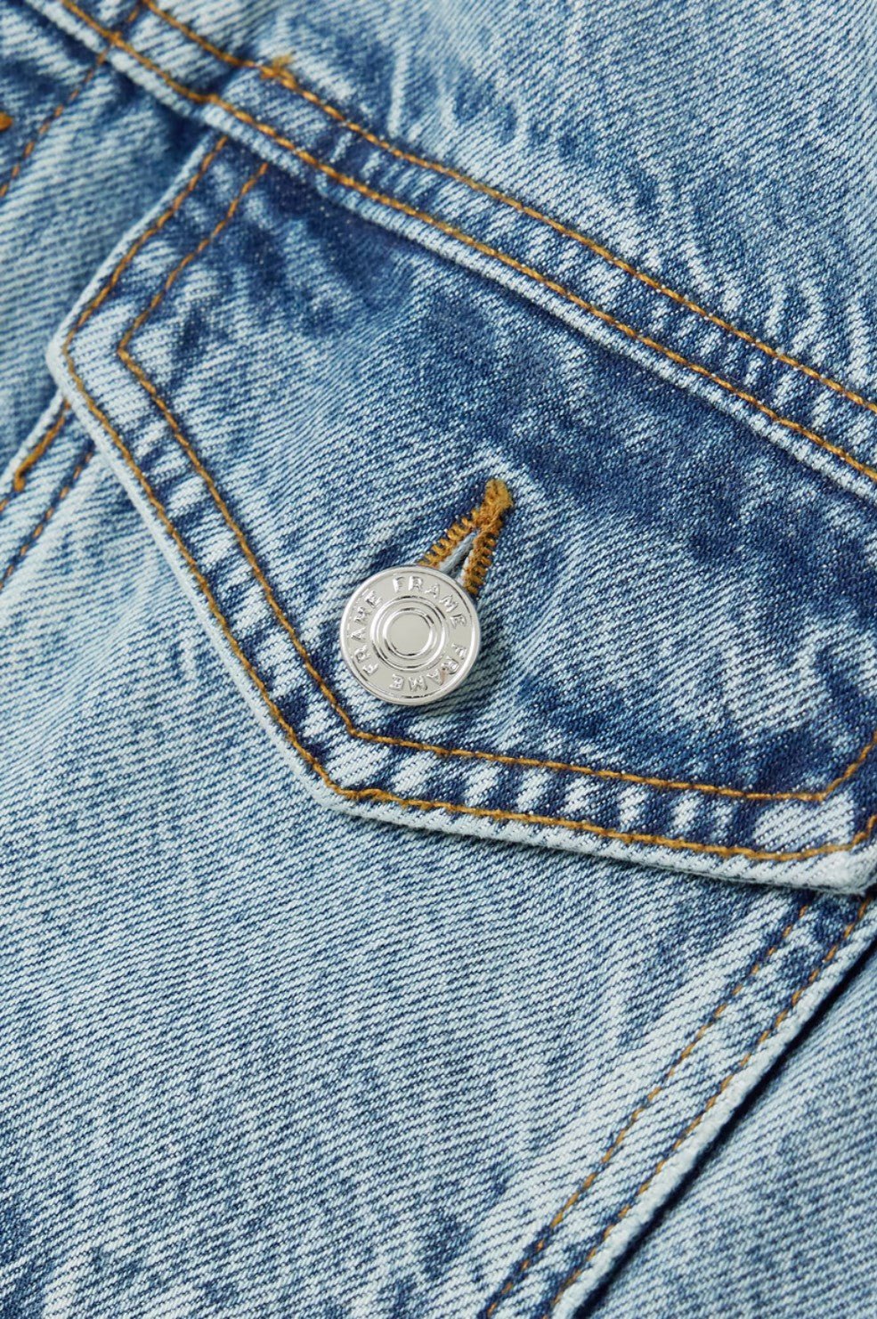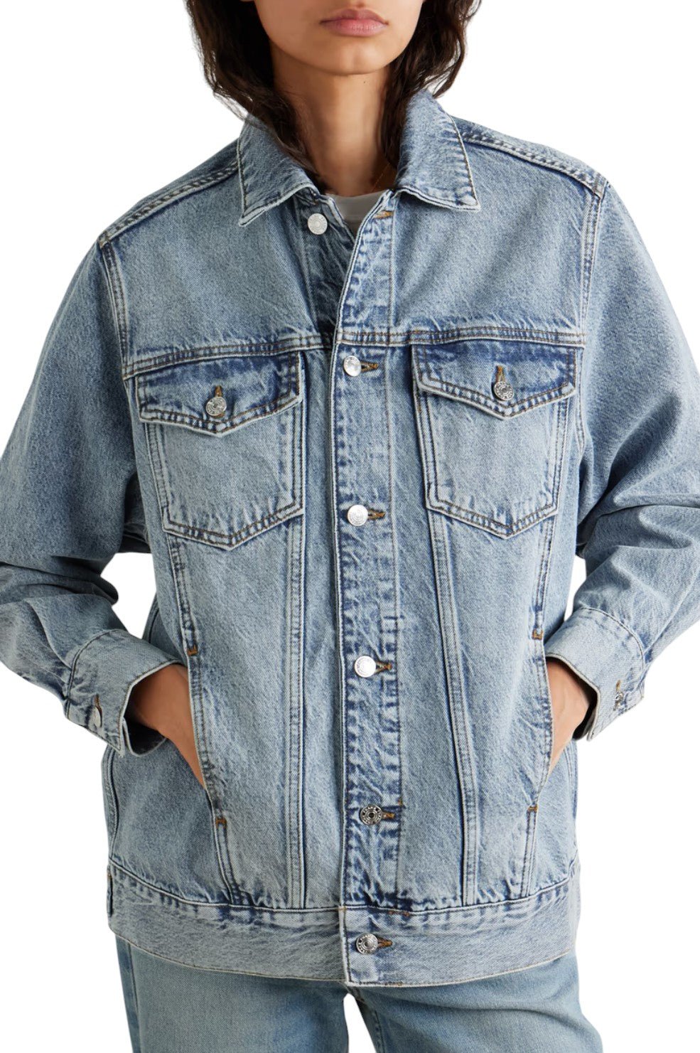 The “Extended Jacket” from Frame offers a relaxed, longline fit in light-blue denim with subtle fading. Featuring button fastenings and discreet seam pockets, it’s made from 100% regenerative cotton, supporting sustainable farming practices that enhance soil health and reduce carbon emissions. Crafted with at least 50% lower-impact materials, this piece blends style with sustainability.